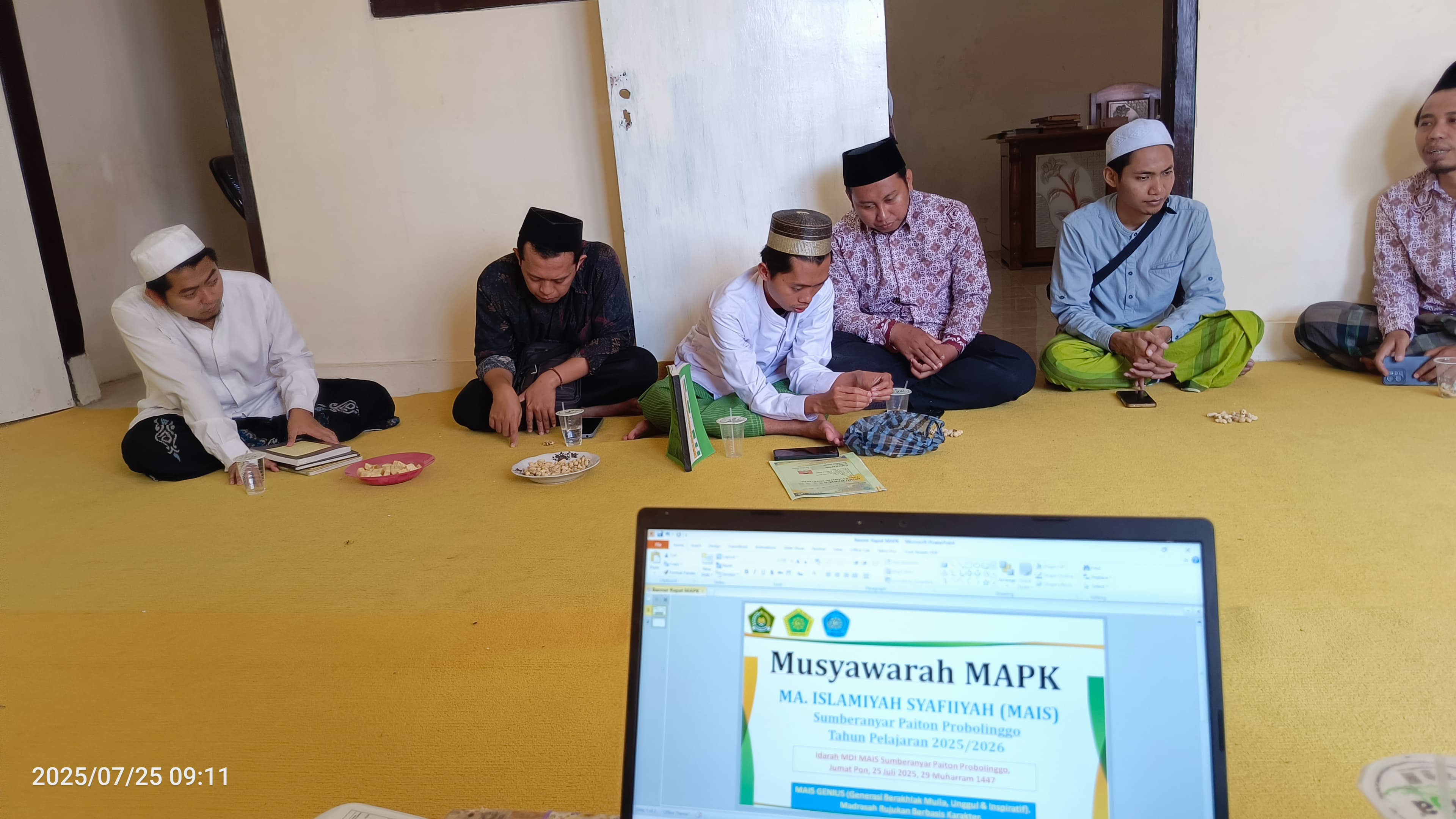 Jumat Pon, 25 Juli 2025/29 Muharram 1447. Musyawarah yang dibuka oleh Salman Farizi, dihadiri oleh semua Guru MAPK yang ada di MA. Islamiyah Syafiiyah (MAIS) baik yang lama maupun baru bergabung. Termasuk juga oleh Pengasuh Pondok Pesantren Islamiyah Syafiiyah, KH. Muhammad Idris Mubarok.